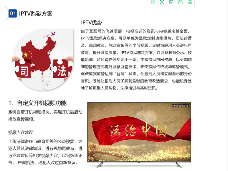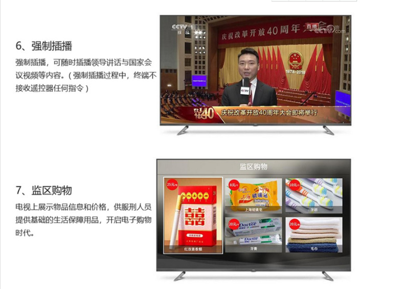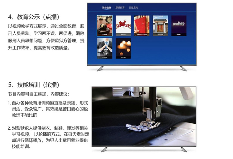 IPTV监狱解决方案,可以单独为监狱定制功能模块,把法律普及、思想教育、党政宣传等的学习视频,定时为服刑人员进行再教育,提升改造质量。IPTV监狱解决方案,以监狱教育公示、技能培训、监区购物等功能于一体,丰富监狱内网资源,以更加精细的管理方式提升监狱监管技术,改变监狱传统被动监管模式,促使监狱监管达到“智能”状态,让服刑人员树立起自己的身份意识,既能让服刑人员了解到监狱的教育改造要求,也能设身处地了解服刑人员购物、法律培训与实时资讯。
