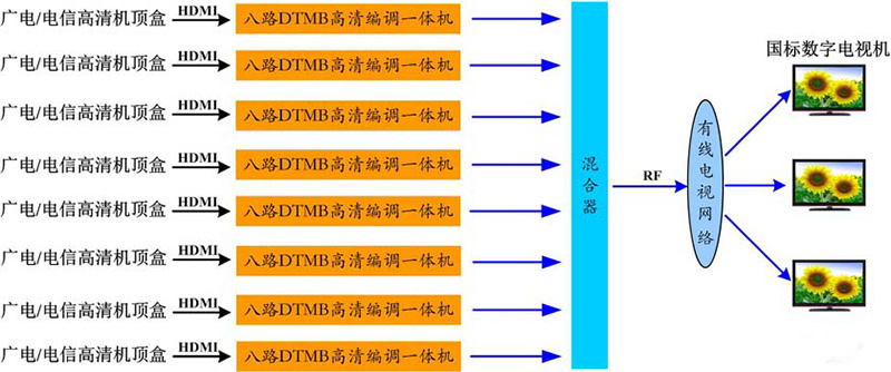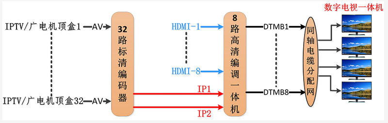 我国地面数字电视广播采用DTMB方案,并且国家强制规定了2015年后新面市的电视机必须自带DTMB(地面数字电视广播)接收功能。故此,本方案将舍弃传统数改模酒店电视解决方案而采用更先进的DTMB方案,作为有线数字电视方案。