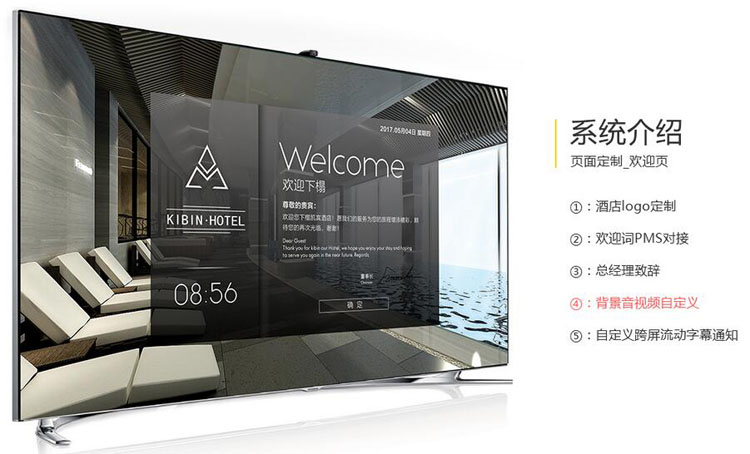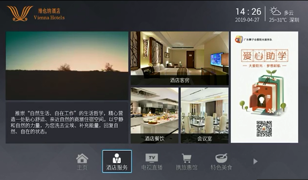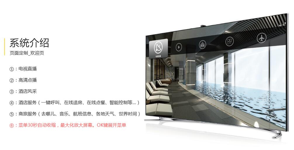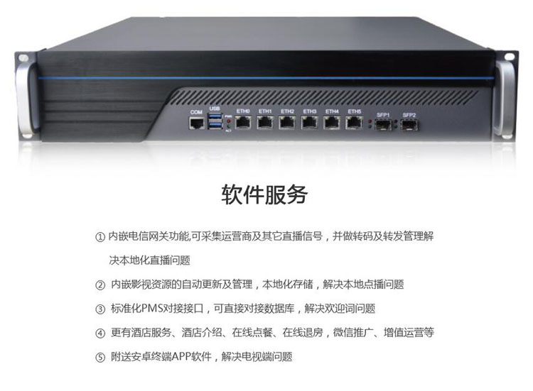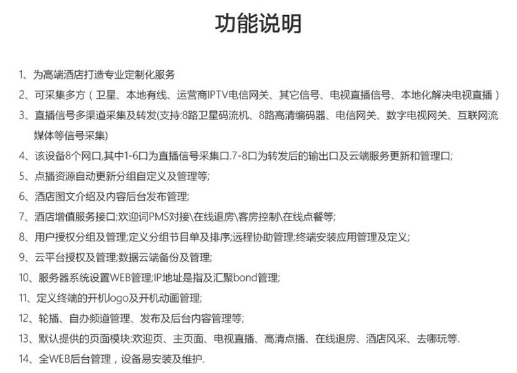 1.内嵌电信网关功能,可采集运营商及其他直播信号,并做转码及转发管理解决本地化直播问题 2 内嵌影视点播资源的自动更新及管理,本地化存储,解决本地点播问题。 3 标准化PMS对接接口,可直接对接酒店客管数据库,解决终端客房电视机开机欢迎词问题。 4 支持酒店服务、酒店介绍、在线点餐、在线退房、微信推广、增值运营等 5 附送安卓终端APK软件,解决终端电视机接收问题。