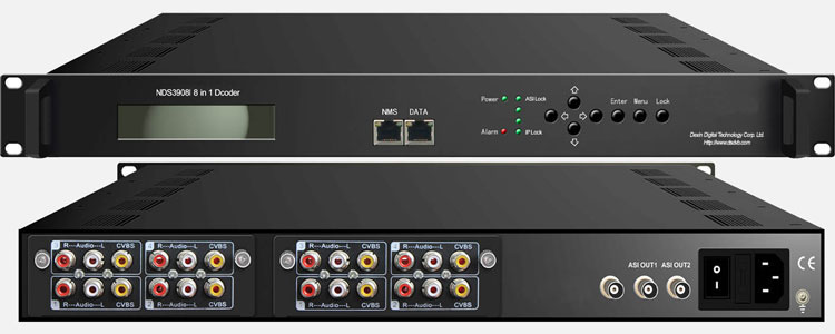 NDS3908I  8合1 多通道IP解码器是我公司开发的具有自主知识产权的先进的数字广播级质量的解码器。设备采用高级传输流处理和*IP处理技术,可支持MPEG-2/H.264/AVS+解码。设备主要功能是将IP转为TS流并进行MPEG-2/H.264/AVS+解码输出。*支持8路IP流(TS流)解码,8路AV输出。