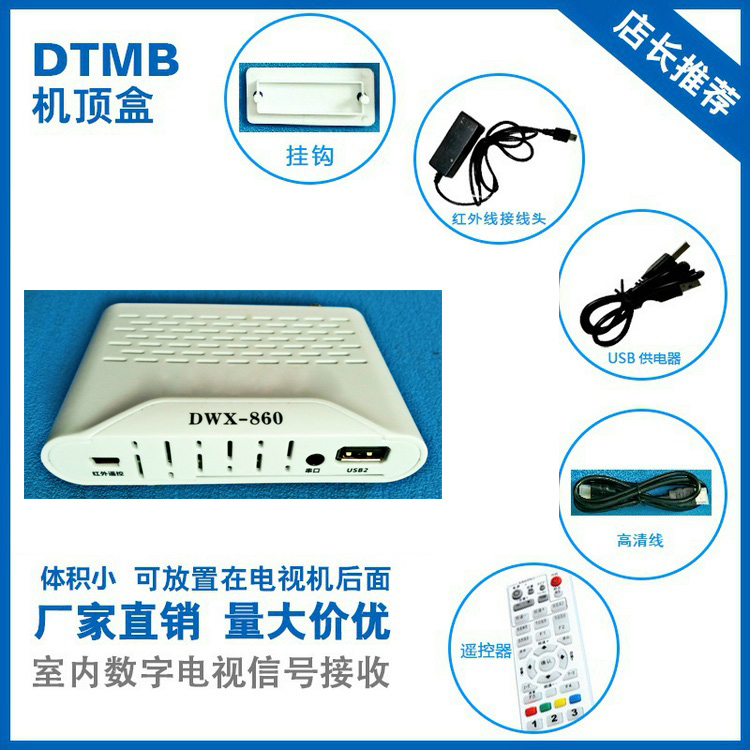 产品推荐说明:专门针对酒店客房老款电视机不能接收数字电视信号替代产品,全国*研发,生产,销售,可隐藏式DTMB迷你高清数字电视机顶盒,标配学习型大号遥控器+HDMI高清数据线+USB供电源+数显红外接收延长器,一应俱全。