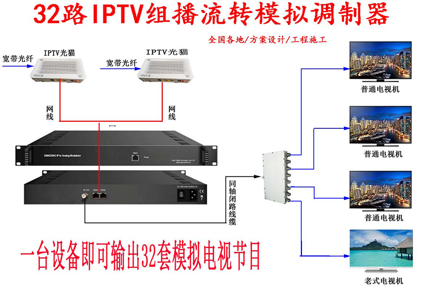 IPTV转32路模拟调制器主要功能就是把运营商IPTV电视信号源实转换成传统模拟有线电视信号输出的功能,配合IPTV网关使用,一台设备支持输出32套捷变邻频调制节目,此款设备仅适用于做传统模拟电视信号的酒店,宾馆,会所,沐足,工厂宿舍等单位,有兴趣的朋友可以来电咨询 酒店,宾馆,会所,沐足,工厂宿舍等单位,非常实用中小型宾馆使用。